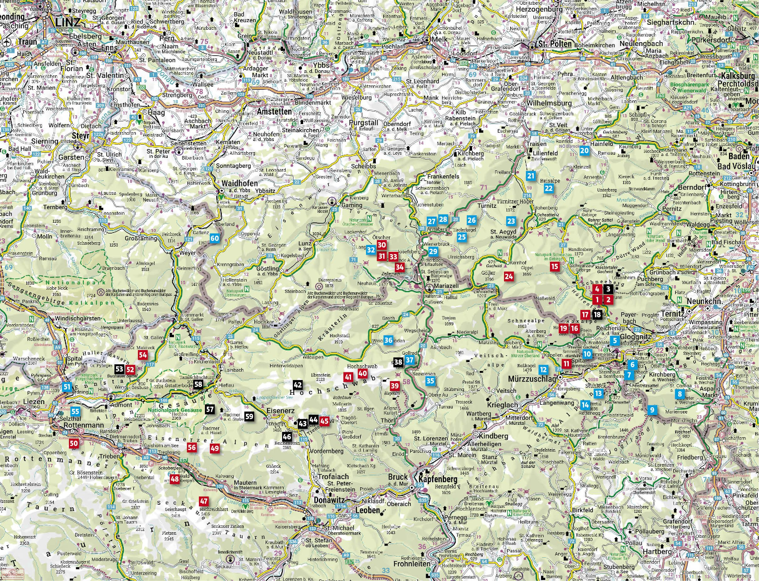 Each ski tour includes all the essential information for getting there by bus and train, a detailed route description, an elevation profile, and a map excerpt with the route marked. Recommendations for places to stop for refreshments, alternative routes, and summit detours complement the tour descriptions. Certified GPS tracks are available for download. An overview map and a handy tour table inside the cover flap make planning for each ski tour easy. Enjoy the winter mountain landscape on skis – sustainably, stress-free, and full of memorable experiences – that's ski touring in Eastern Austria by train and bus!