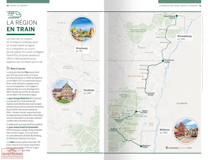 - Des itinéraires à vélo et sans voiture : un cahier détachable réunit des parcours à vélo emblématiques –; les Vosges du Nord, la Véloroute des Vignobles, le Petit Tour de l'Alsace, la Haute vallée de la Thur et route des Crêtes –; avec les traces GPX pour suivre chaque trajet en temps réel. Le guide propose aussi des itinéraires sans voiture, de 3 jours à 15 jours, pour visiter l'Alsace autrement.