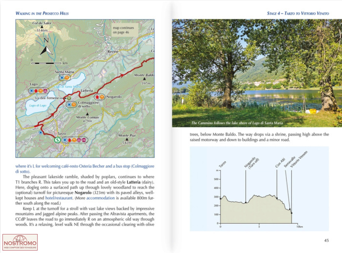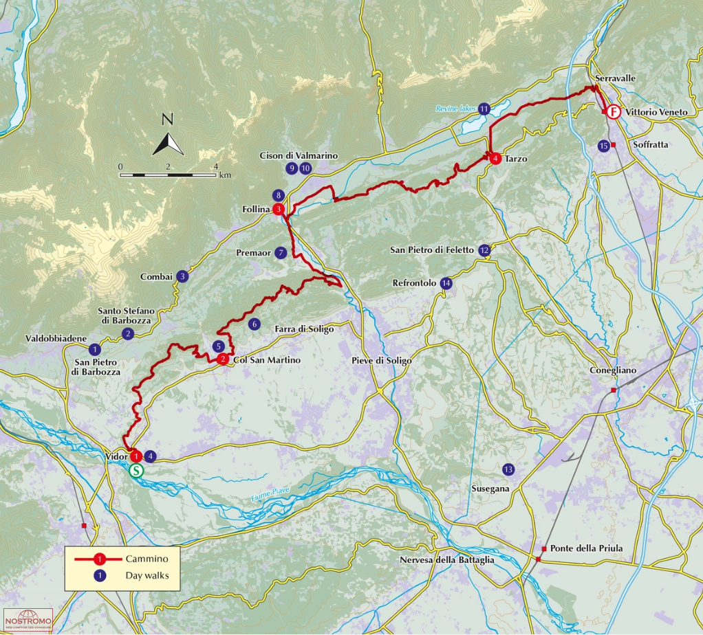 The day walks range from 2 to 13km (1–8 miles) in length and can be enjoyed in 1–3 hours. The Cammino delle Colline del Prosecco between Vidor and Vittorio Veneto is described in 4 stages covering 51km (32 miles).