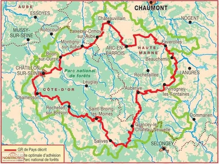 L’itinéraire fait le tour du Parc national de forêts, le plus récent des parcs nationaux français. Majoritairement forestier, il traverse de vastes hêtraies et chênaies anciennes, des plateaux calcaires et des sites naturels remarquables comme le plateau de Langres, le cirque de la Coquille ou la tufière de Rolampont.