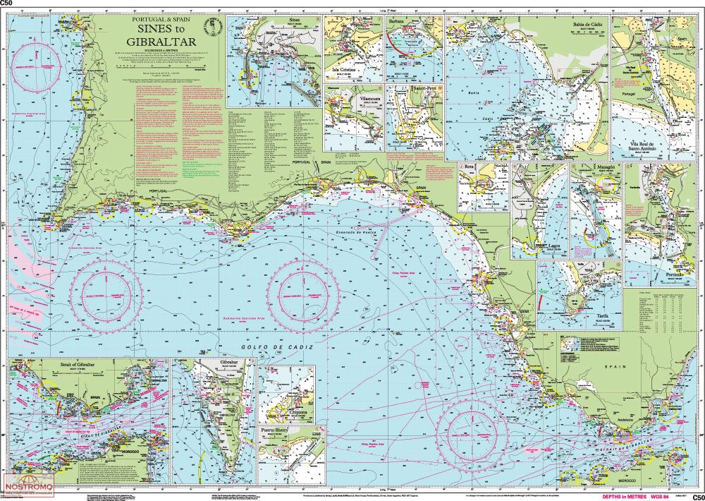 On this the latest depth surveys have been applied. Harbour developments in Gibraltar are included as are the latest firing practice areas in Golfo de Cadiz. The chart specification has been improved to show coloured light flashes. There has been general updating throughout.