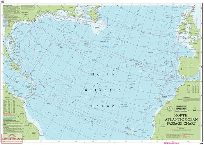 À l'échelle 1:7 620 000, cette carte couvre l'Atlantique Nord, du Brésil à Terre-Neuve et de Gibraltar aux Caraïbes. Construite selon une projection conique, elle permet de tracer les trajectoires orthodromiques en lignes droites plutôt qu'en courbes. La carte 100 présente les principales tendances des isotopes de profondeur, les limites des glaces, les variations magnétiques et les routes clés identifiées par Donald M. Street Jr.