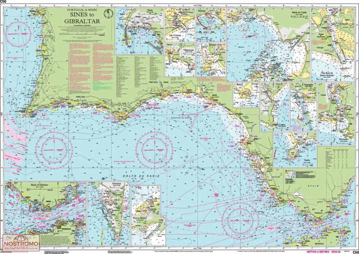 Ce document a été réalisé à partir des derniers relevés de profondeur. Les aménagements portuaires de Gibraltar sont inclus, ainsi que les dernières zones d'exercice de tir du golfe de Cadix. La spécification cartographique a été améliorée pour afficher des éclats lumineux colorés. Une mise à jour générale a été effectuée.