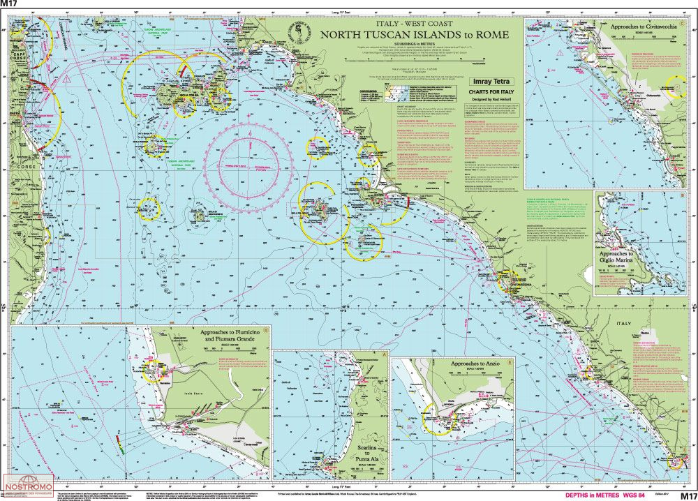 Pour cette carte de 2023, les dernières profondeurs connues ont été appliquées. Les aménagements portuaires de Civitavecchia et Fiumicino sont inclus, ainsi que la zone réglementée à l’approche d’Anzio. Le DST du Canal de Corse est indiqué, tout comme l’étendue des aires marines protégées. La spécification de la carte a été améliorée pour afficher des éclats lumineux de couleur. Une mise à jour générale a été effectuée.