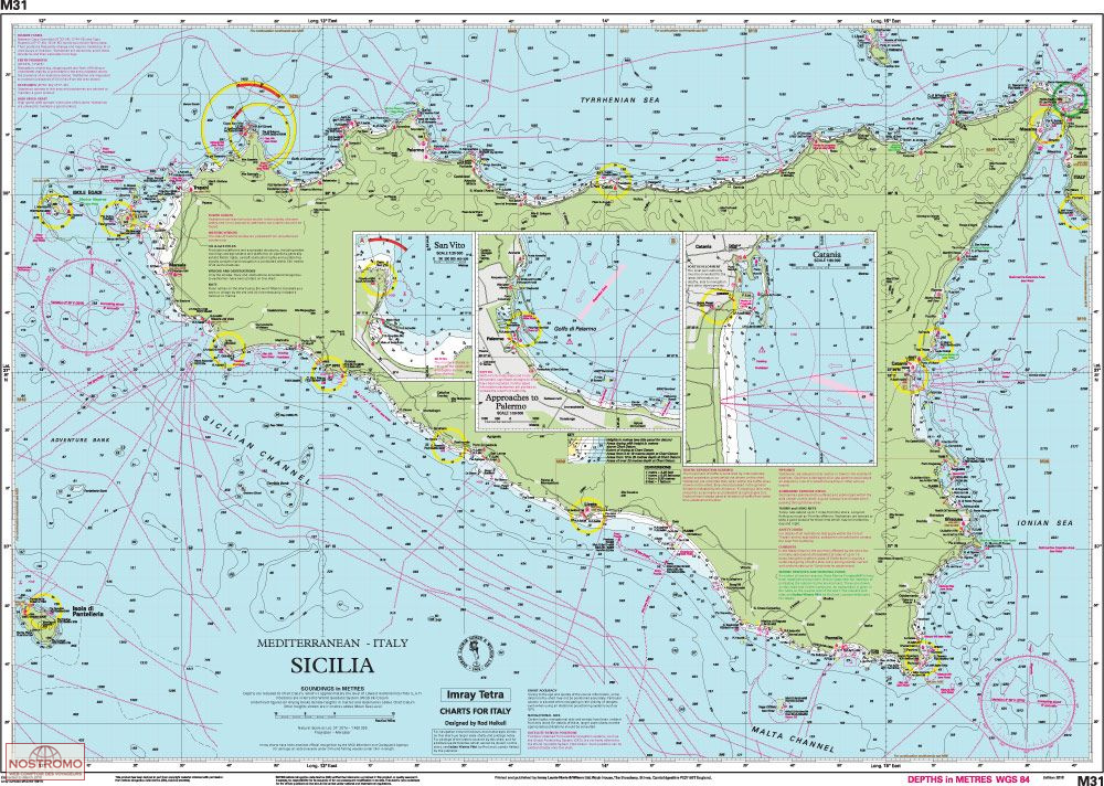 Pour cette édition 2023, la carte a été entièrement mise à jour avec les derniers relevés de profondeur connus, ainsi que des modifications apportées aux câbles et aux aides à la navigation. La carte a été remaniée pour afficher les nouveaux plans de San Vito Lo Capo et de Catane, et l'île de Pantelleria figure désormais sur la carte principale.