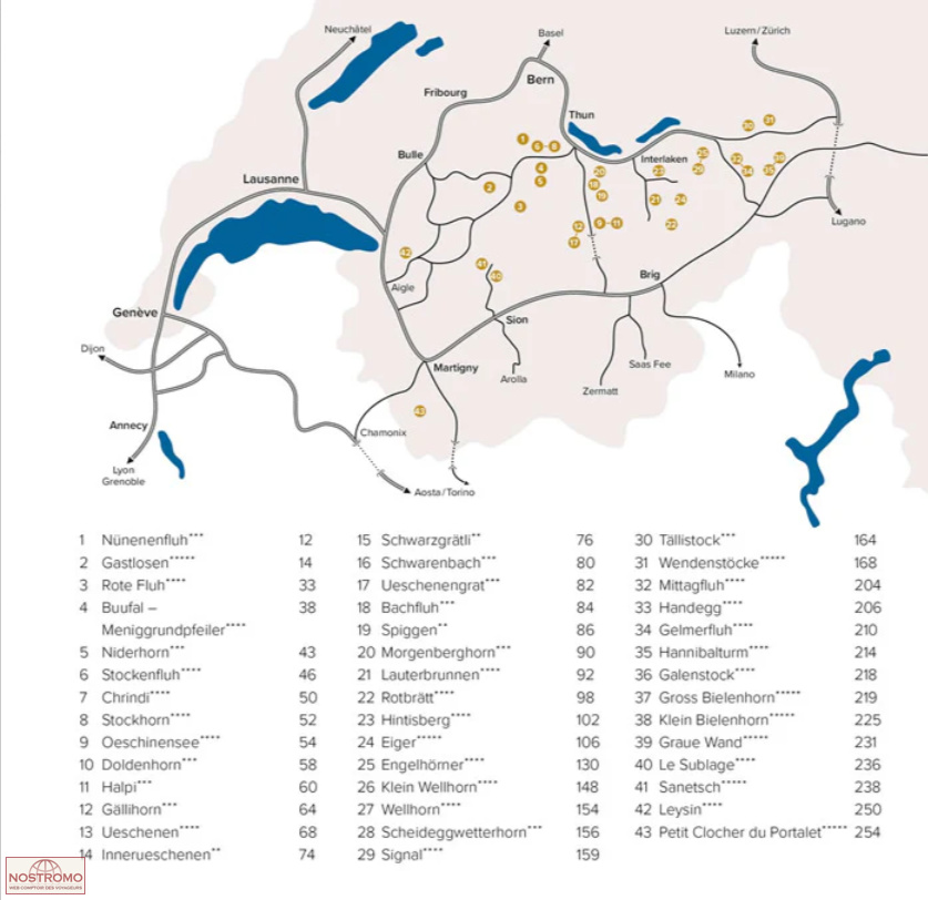 In total 43 separate crags are described with the emphasis on long alpine multi-pitch routes. Some of the crags included are Eiger, Wendenstocke (Wenden), Petit Clocher du Portalet, Gastlosen, Gross Bielenhorn, Klein Bielenhorn, and Graue Wand.