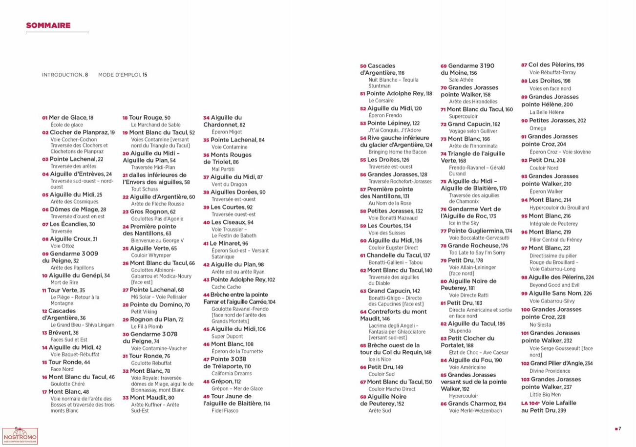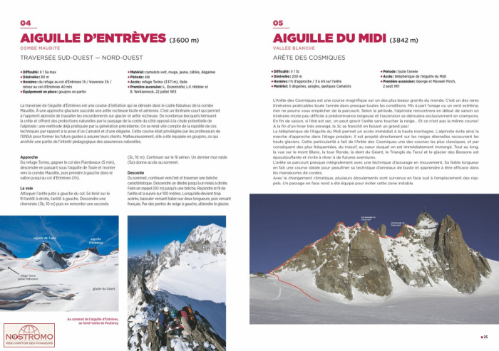 L’auteur aborde l’historique et l’ambiance de chaque course avant de donner tous les renseignements techniques nécessaires, complétés par des tracés sur photos et des croquis détaillés. Une grande place est donnée à l’aspect visuel grâce à de nombreuses photographies de qualité valorisées par le grand format de l’ouvrage. Le choix des courses a été déterminé par la qualité du rocher, de l’équipement, l’esthétique de l’environnement, le prestige du sommet, l’engouement qu’elles suscitent… Les pratiques modernes sont à l’honneur : goulottes qui ne se forment qu’en hiver, falaises d’altitude équipées pour l’escalade libre difficile, enchaînements d’arêtes et traversées de grands sommets… Il y en a pour tous les goûts. À côté de noms aussi connus que l’arête des Cosmiques, la Directe américaine aux Drus, le couloir Whymper à la Verte, le Linceul et la Walker aux Jorasses ou l’arête Kuffner au Maudit, on trouve par exemple Le festin de Babeth aux Ciseaux, No Siesta aux Jorasses ou Ma Dalton à l’aiguille du Midi.
