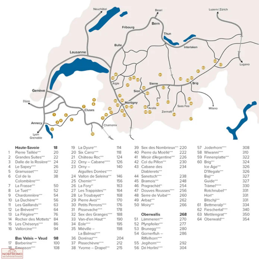 3) Haut-Valais (Suisse) : Elle couvre l'escalade autour de Brigue, y compris Wiwanni, le vallon de Fiescher et le vallon de Tourtemagne.