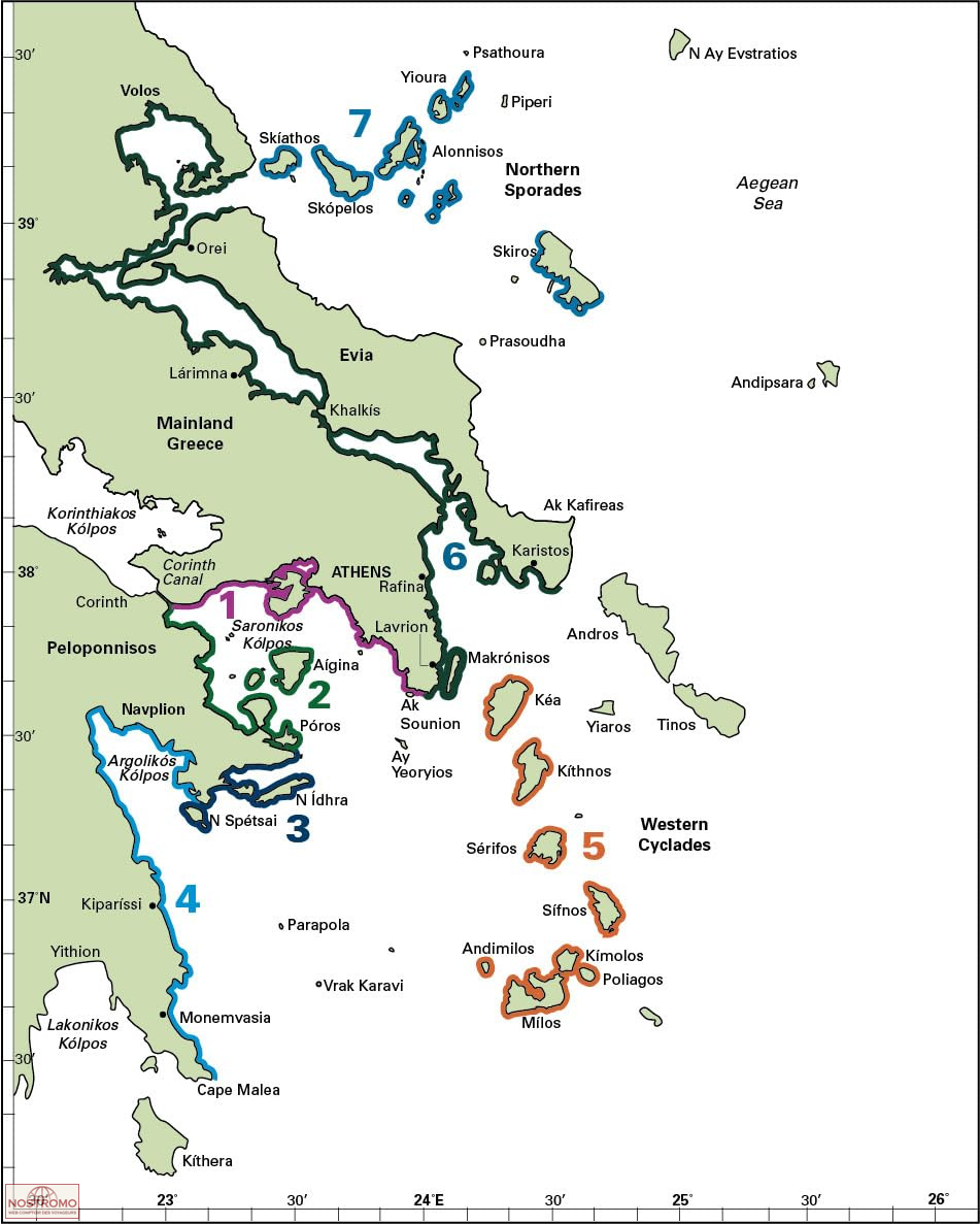 Le guide « West Aegean » de Rod et Lucinda Heikell couvre les côtes et les îles proches d'Athènes, les îles voisines des Cyclades et le Péloponnèse oriental jusqu'à Monemvasia. Il aborde également la côte grecque continentale, de Sounion à Volos, la côte adjacente d'Eubée et les Sporades du Nord, notamment Skíathos et Skópelos.