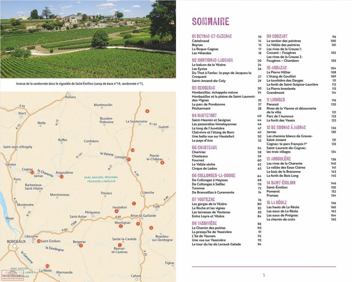 Vallée de la Dordogne • Beynac • Vallée de l’Homme • Montignac • Bergerac • Monbazillac • Vallée de l’Auvézère • Hautefort • Causse corrézien • Chasteaux • Collonges-la-Rouge • Turenne • Gorges de la Vézère • Le Saillant • Vassivière • Vallée des Peintres • Crozant • Monts d’Ambazac • Limoges • Cognac • Jarnac • Angoulême • Saint-Émilion • La Réole