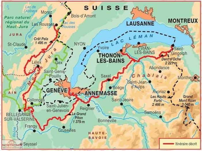 Plus de 10 jours d’itinérance, entre les Rousses et Thonon-les-Bains, pour relier le massif du Jura aux Alpes en passant par les sentiers jurassiens, aindinois et hauts-savoyards. De plateaux en crêtes, de vallées enclavées en belvédères, cet itinéraire qui s’approche fréquemment de la frontière avec la Suisse offre de magnifiques panoramas, notamment sur le lac Léman et le Mont-Blanc.
