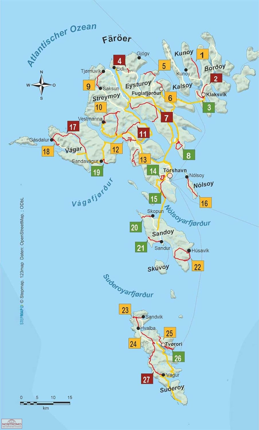 Die schroffen, mitten im Nordatlantik liegenden Färöer bestehen aus 18 Inseln und gelten als Geheimtipp für Naturliebhaber und Wanderfreunde. Auf uralten Wegen wandern Sie durch das Reich der Vögel und Schafe und genießen atemberaubende Ausblicke über markante Berggipfel, steile Grashänge und pittoreske Dörfer. Dieses Buch beschreibt 27 abwechslungsreiche Routen, von einfachen Kurztouren bis zu anspruchsvollen Bergbesteigungen. Karten, Höhenprofile und GPS-Tracks erleichtern die Orientierung vor Ort. Allgemeine Infos zu Themen wie Anreise und Reisezeit, Hinweise zu Wegbeschaffenheit und Markierungen sowie Tipps für Varianten machen den Wanderführer zu einem unentbehrlichen Wegbegleiter.