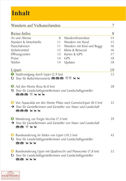 Nach einer Einleitung zur Region bzw. der Wanderinfrastruktur beschreiben die Autoren 21 Tageswanderungen auf sechs der sieben liparischen Inseln. Bei der Tourenauswahl haben die Autoren bewusst auf Vielfalt geachtet: Die Touren sind mal als Strecken-, mal als Rundtour beschrieben und entsprechen verschiedenen Schwierigkeitsniveaus. Alle Touren bieten besondere Highlights; seien es kulturelle oder natürliche Sehenswürdigkeiten oder einfach nur tolle Aussichten. Fast immer gibt es zumindest am Ende eine Einkehrgelegenheit. Wie bei der Reihe „Outdoor Regional“ üblich gibt es bei jeder Tour Hinweise, wieweit die Wanderungen für Familien bzw. Kinder sowie für Hunde geeignet sind. Bei der Orientierung helfen neben der genauen Wegbeschreibung die Karten im Maßstab 1:25.000/1:50.000, die Übersichtskarte in der Umschlagklappe und die GPS-Tracks zu jeder Tour, die kostenlos im Internet heruntergeladen werden können. Das handliche und leichte Format ist ideal für unterwegs.