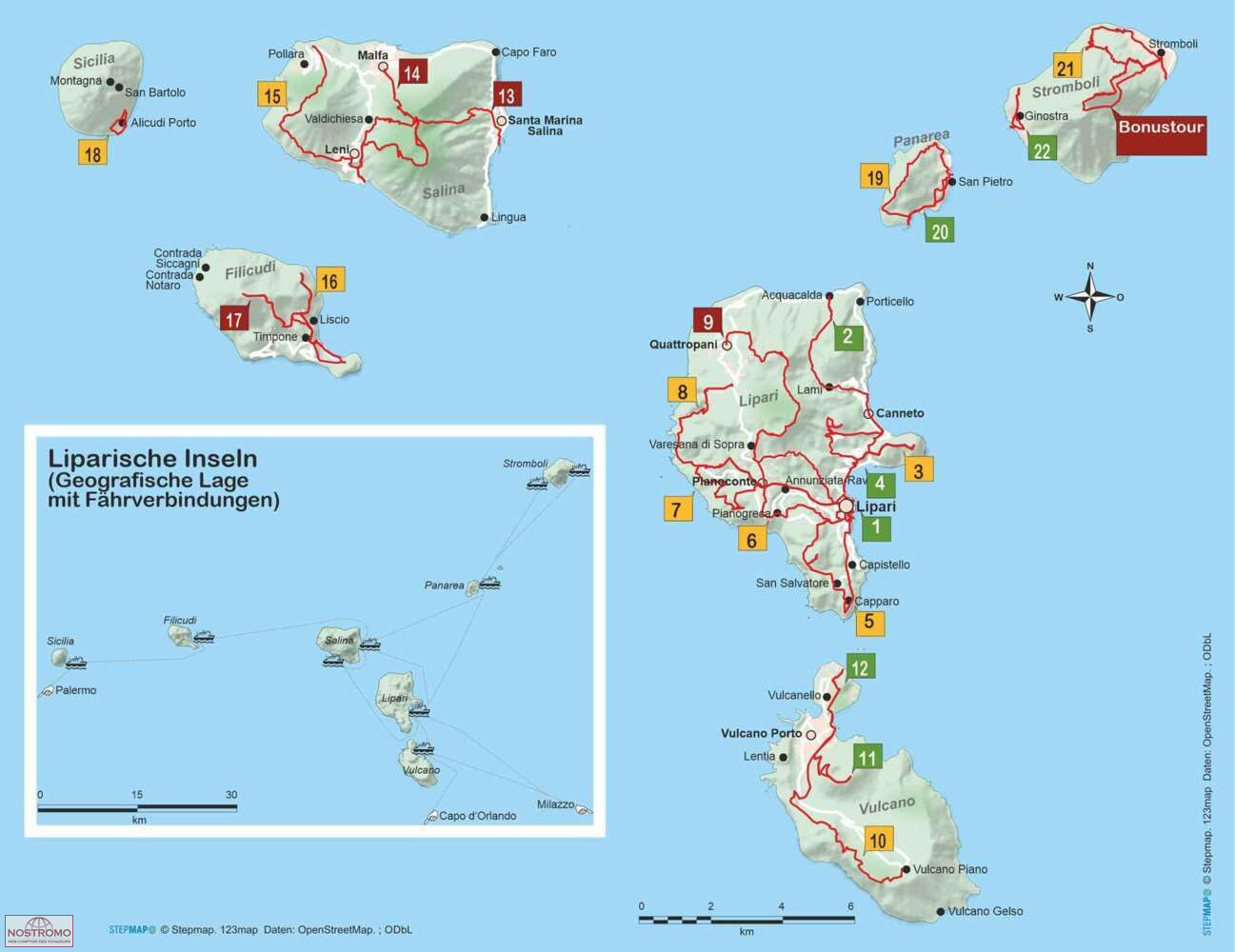 Îles Éoliennes - où sont-elles? Mais au plus tard lorsque le nom de "Stromboli" apparaît, l'une des 7 îles de l'archipel, certains ont une idée: "quelque part près de la Sicile". Plus précisément: Les îles Lipari (ou: Eoliennes) sont un archipel volcanique entre Naples et la Sicile, le volcan le plus célèbre, le Stromboli, est souvent mentionné dans le même souffle que le Vésuve et l'Etna. En basse saison, d'avril à juin et de septembre à octobre, les îles Éoliennes proposent aux amateurs de randonnées des circuits variés de différents niveaux de difficulté - chaque île a sa propre touche.