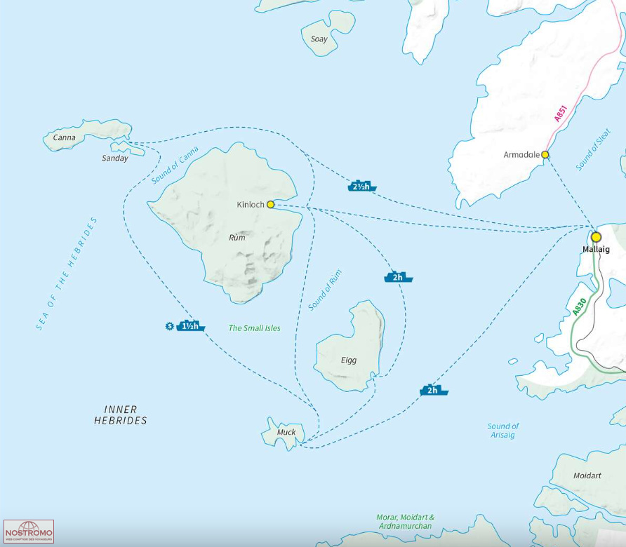 Les itinéraires varient de la petite randonnée à la randonnée plus longue, avec notamment un circuit exigeant de trois jours de 41 km autour de la côte de Rum. Les randonnées varient de 3 à 41 km et peuvent être effectuées en 1 à 3 jours, selon l'itinéraire. De nombreuses randonnées sont circulaires, tandis que d'autres relient des sites ou des points de vue clés de l'île. Le terrain varié comprend des sentiers de montagne accidentés, des landes, des pâturages ouverts et des sentiers côtiers.