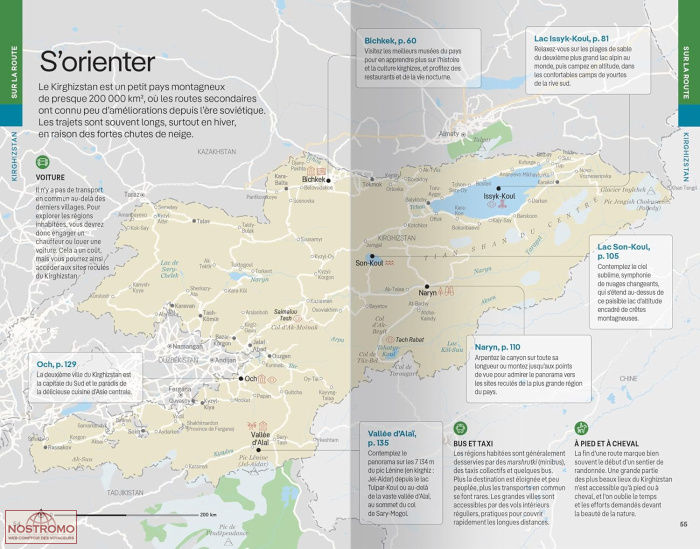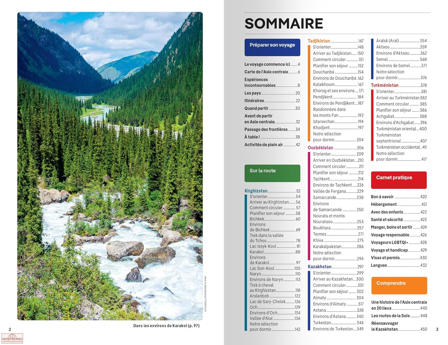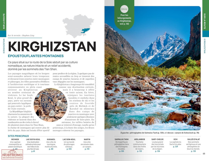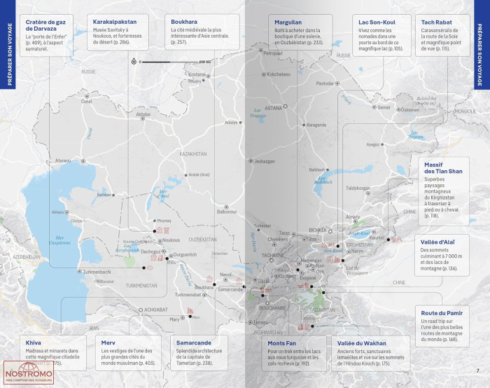 Des pages détaillées qui mettent en avant les sites incontournables de chaque pays : le parc national d'Aa Archa, le lac Song Köl ou encore les pétroglyphes de Saimaluu Tach au Kirghizstan ; la route du Pamir (deuxième plus haute route de la planète) ou la citadelle de Khodjent datant du Xe siècle au Tadjikistan ; le merveilleux Registan (joyau architectural timouride) ou le minaret Kalon de Boukhara en Ouzbékistan ; le musée national de la République du Kazakhstan dans la capitale Astana ou le cosmodrome de Baïkonour au Kazakhstan ; les fondations antiques de Merv, célèbre site archéologique, les cratères de gaz de Darvaza (aussi appelés " portes de l'Enfer ") ou le désert coloré du canyon de Yangykala au Turkménistan...