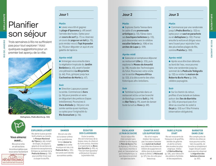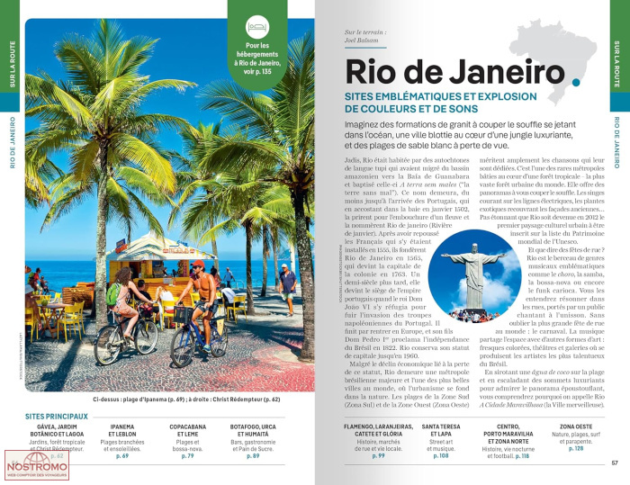 - Des sélections d' itinéraires thématiques à pied, à vélo ou en voiture : balade artistique dans le quartier de Santa Teresa à Rio, remonter l' Avenida Paulista, le Times Square de São Paulo, promenade au bord de l'eau à Belém, à vélo dans le centre de Brasília, traversée de la zone humide du Pantanal... Mais aussi des itinéraires régionaux pour découvrir le meilleur du Brésil, en toute saison, quel que soit le temps ou le budget disponible.