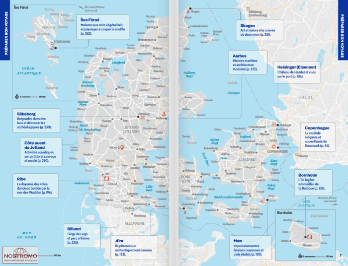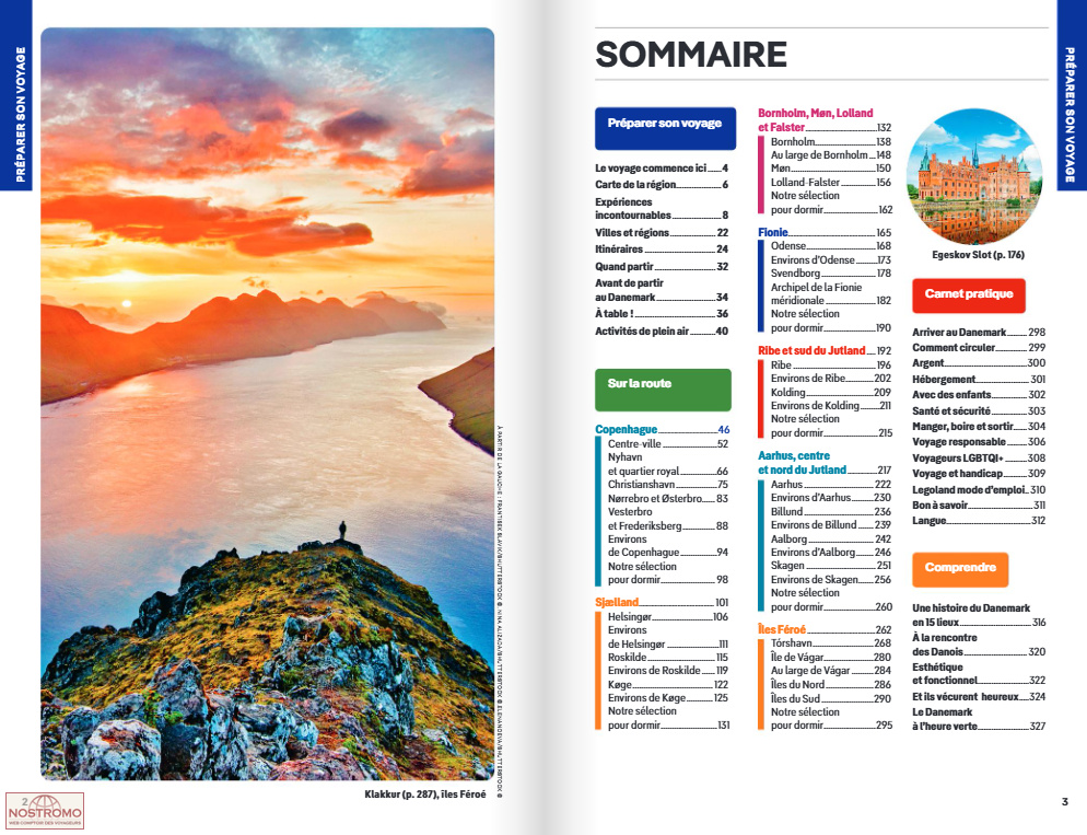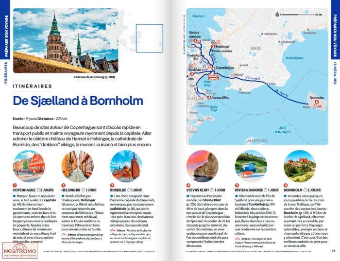 Des pages détaillées qui mettent en avant les sites incontournables : les jardin de Tivoli, le plus vieux parc d'attraction ; le quartier post-industriel branché de Refshaleøen ; Kronborg Slot, le château de Hamlet ;Frederiksborg Slot, le Versailles danois ; Egeskov Slot cerclé d'enceintes impressionnantes ; Moesgaard Museum qui propose un exploration mémorable de la préhistoire ; le parc à thème Legoland.