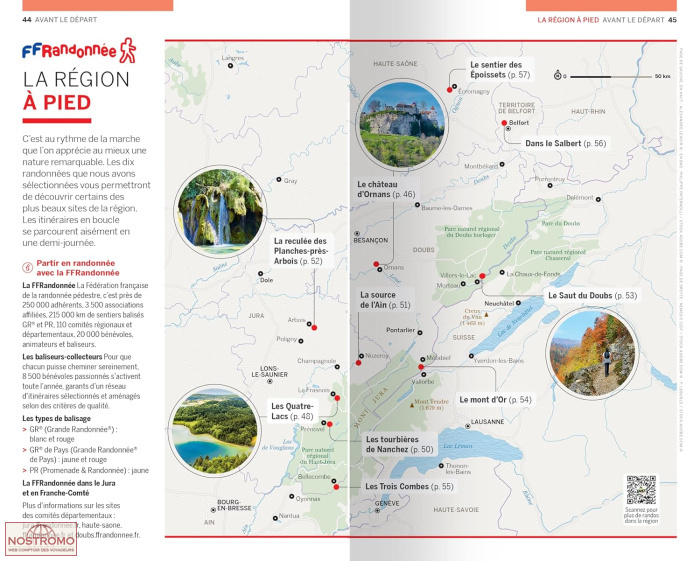 - Les sites incontournables du Jura et la Franche-Comté : la cascade du Hérisson, le Grand Colombier, le mont d'Or, les bassins du Doubs, le plateau des Mille Étangs, les gorges de l'Areuse, le lac de Vouglans, le lac de Bonlieu, Besançon, Belfort, Vesoul, Pontarlier, Neuchatel, Arbois, Poligny, Ornans, Sainte-Ursanne...