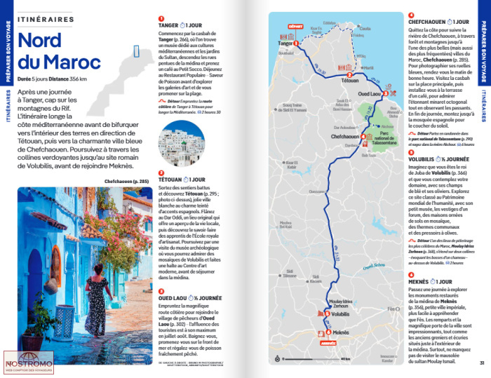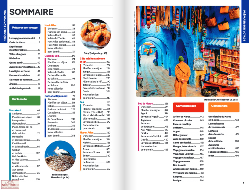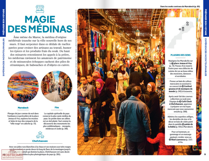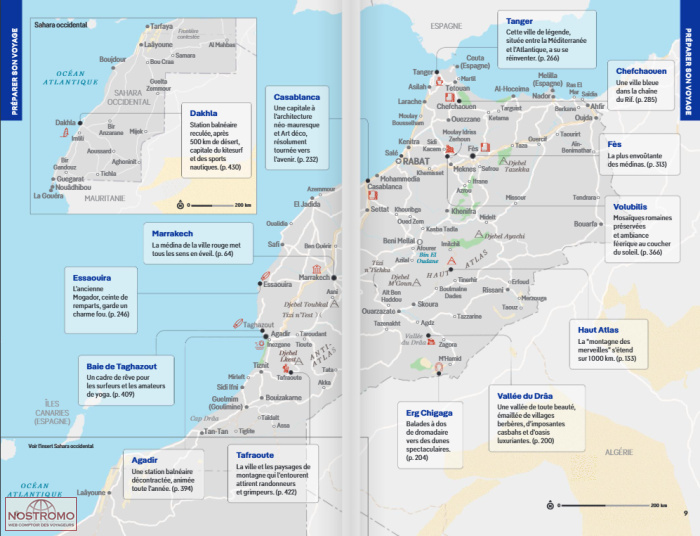 Avec des focus plus précis sur des sites à ne pas manquer : le jardin Majorelle et le musée Yves Saint-Laurent à Marrakech ; les studios de cinéma à Ouarzazte ; la mosquée Hassan II à Casablanca...