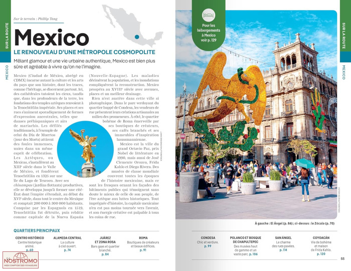 - Des sélections d' itinéraires thématiques à pied, à vélo ou en voiture : les charmantes rues pavées de San Ángel à Mexico, le tour des cénotes depuis Mérida, le street art à Oaxaca, à vélo le long du Malecón à Mazatlán, le meilleur de la Costalegre en voiture, du désert à la mer dans la péninsule de Basse-Californie... Mais aussi des itinéraires régionaux pour découvrir le meilleur du Mexique, en toute saison, quel que soit le temps ou le budget disponible.