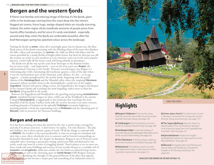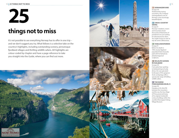 - Must-see pick - unmissable sights handpicked by our authors - Geirangerfjord, cross-country skiing, Vigelandsparken, wildlife safaris in Svalbard, The Norsk Fiskevaersmuseum in Å, Tte Oslofjord, Værøy's seabird colonies, Hjørundfjord, Bergen, Ålesund, the Flåmsbana, Whale-watching in Andenes, Nidaros Domkirke in Trondheim, the Jostedalsbreen glacier, Urnes Stave Church