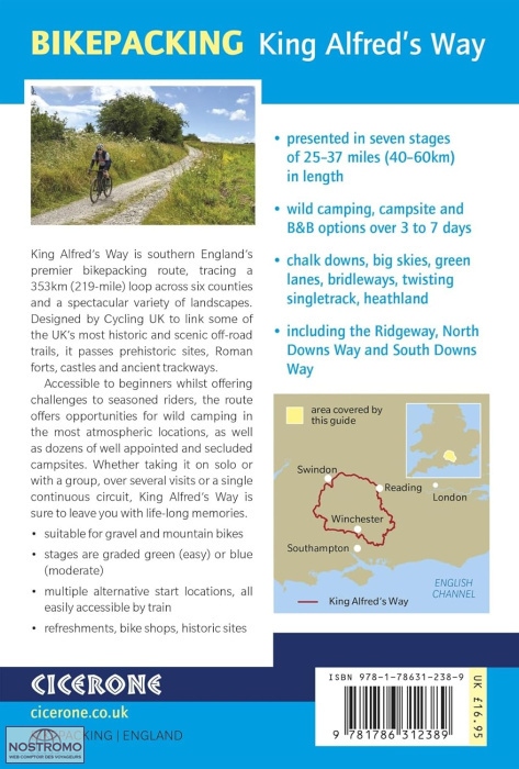 A guidebook to bikepacking King Alfred's Way, a 353km loop in seven stages between 40 and 60km (25-37 miles), with options for wild camping, campsites and accommodation.